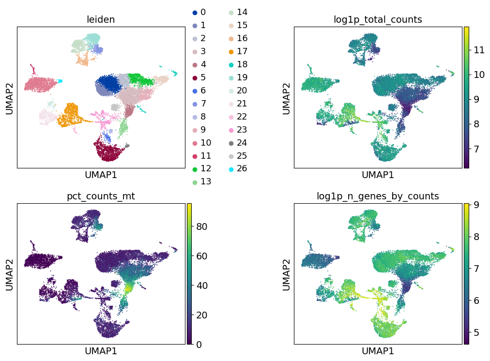 As indicated before, we will now re-assess our filtering strategy by visualizing different QC metrics using UMAP.