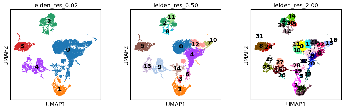 color=["leiden_res_0.02", "leiden_res_0.50", "leiden_res_2.00"],