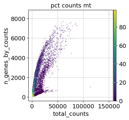 Additionally, it is useful to consider QC metrics jointly by inspecting a scatter plot colored by pct_counts_mt.