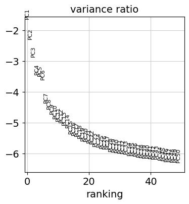Let us inspect the contribution of single PCs to the total variance in the data. This gives us information about how many PCs we should consider in order to compute the neighborhood relations of cells, e.g. used in the clustering function leiden() or tsne(). In our experience, there does not seem to be signifigant downside to overestimating the numer of principal components.