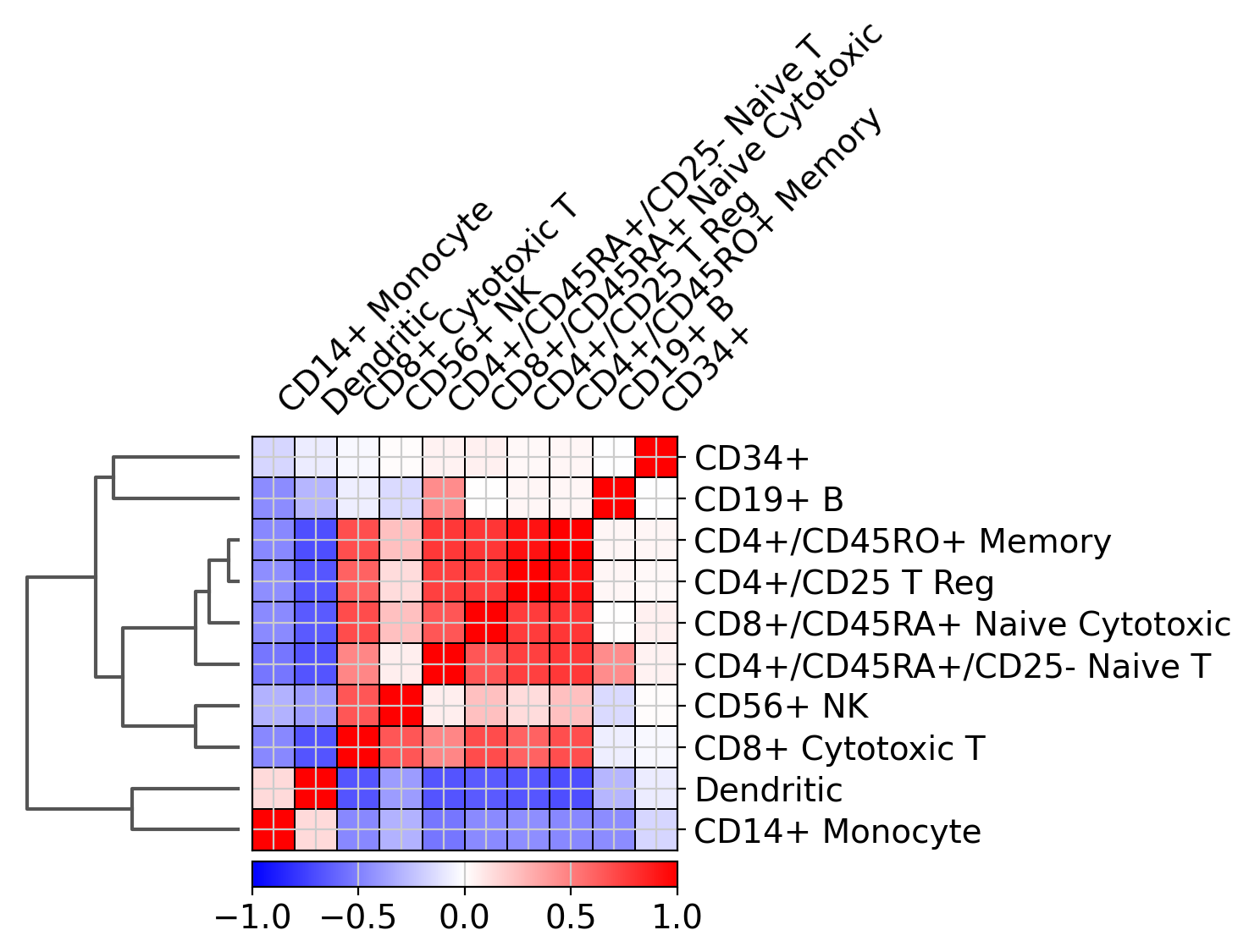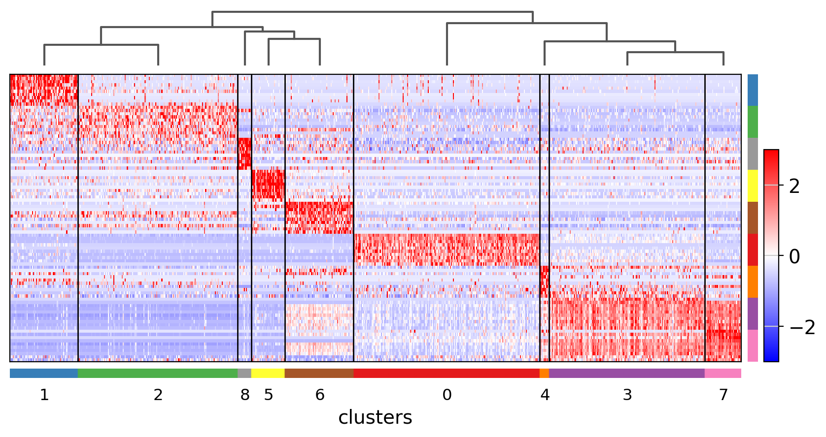 Also, it is also useful to add a dendrogram to the graph to bring together similar clusters. The hierarchical clustering is computed automatically using the correlation of the PCA components between the clusters.