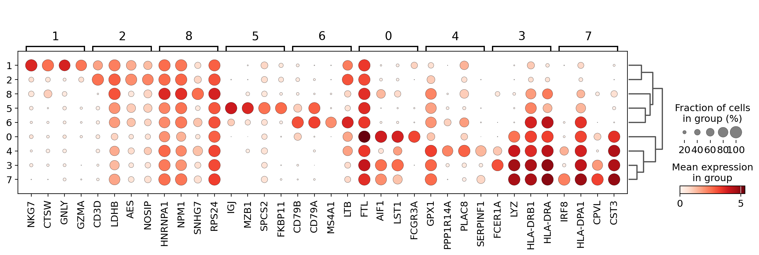 A quick way to check the expression of these genes per cluster is to using a dotplot. This type of plot summarizes two types of information: the color represents the mean expression within each of the categories (in this case in each cluster) and the dot size indicates the fraction of cells in the categories expressing a gene.