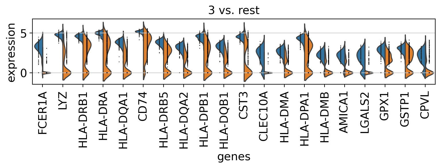 In scanpy, is very easy to compare marker genes using split violin plots for all groups at once.