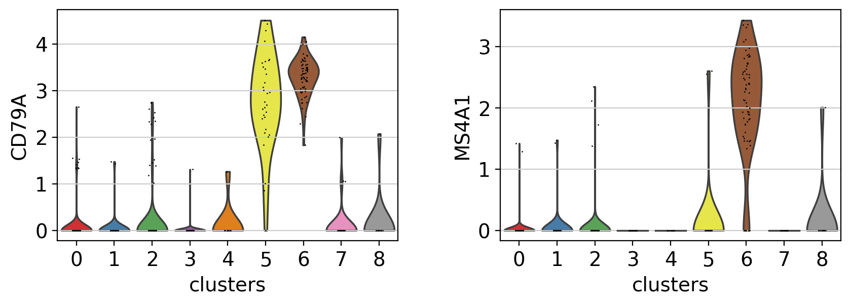 A different way to explore the markers is with violin plots. Here we can see the expression of CD79A in clusters 5 and 8, and MS4A1 in cluster 5.Compared to a dotplot, the violin plot gives us and idea of the distribution of gene expression values across cells.